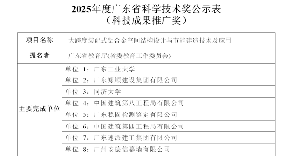 關于廣東速派建工集團有限公司申報2025年度廣東省科學技術獎的公示 --大跨度裝配式鋁合金空間結構設計與節能建造技術及應用